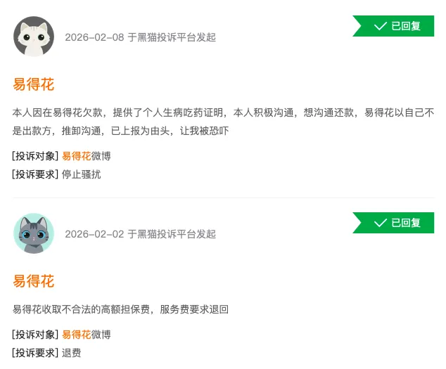 近期,黑猫投诉、聚投诉等多家消费者投诉平台集中涌现关于助贷平台“易得花”的投诉信息,投诉量呈爆发式增长。大量借款人反映,该平台通过叠加高额担保服务费、拆分计息主体等隐蔽手段,将实际综合融资成本推至36%左右,远超监管划定的24%司法保护上限,涉嫌变相开展高利贷业务,严重侵害金融消费者的知情权、公平交易权和财产安全权,成为助贷行业违规高定价的典型反面案例。