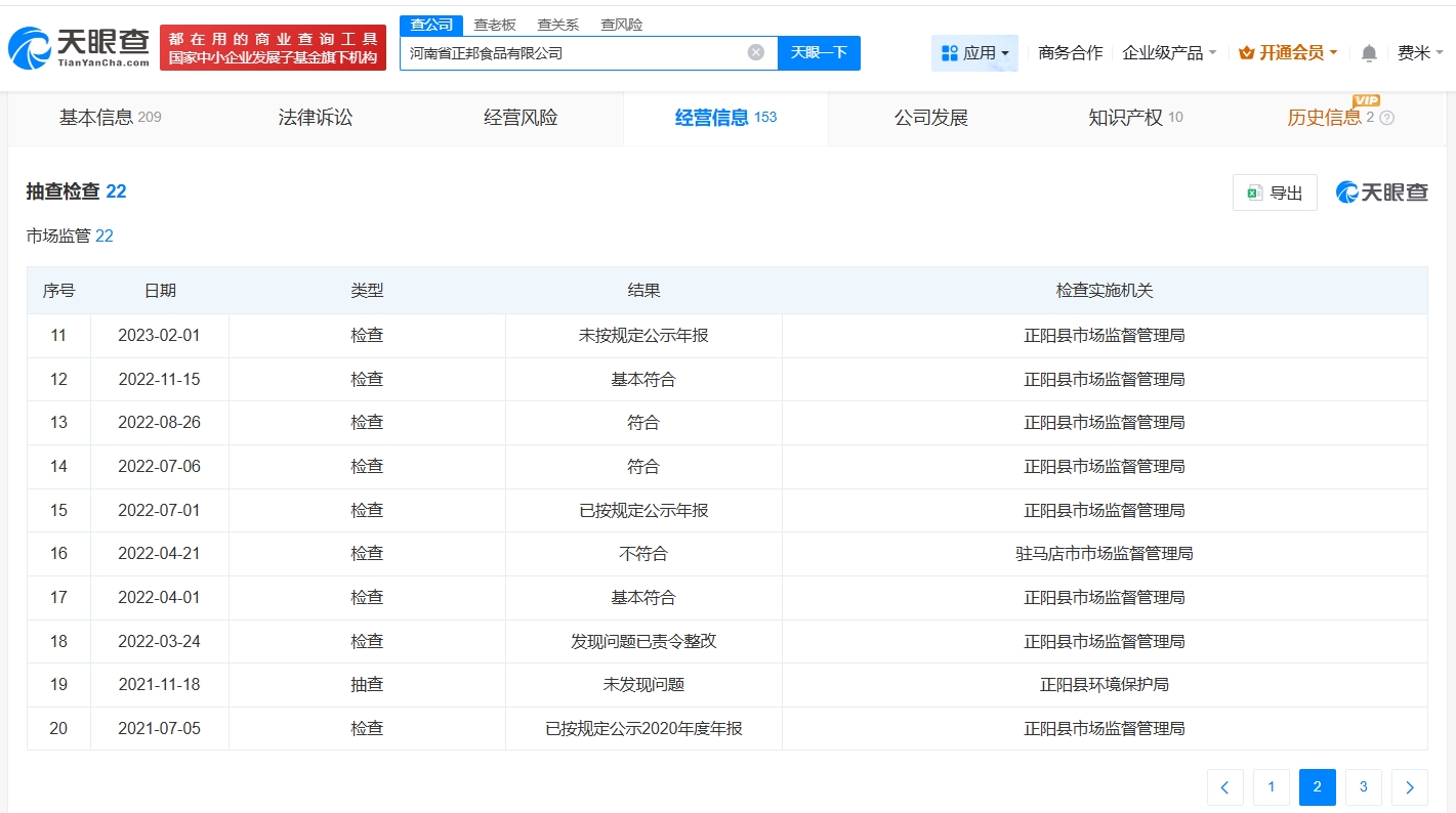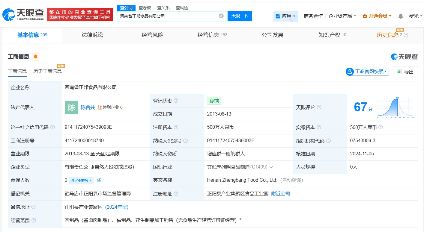 天眼查App显示,涉事公司河南省正邦食品有限公司成立于2013年8月,法定代表人为陈善共,注册资本500万人民币,经营范围为肉制品、蛋制品、花生制品加工销售。股东信息显示,该公司由陈善共、章爱娟共同持股。参保人数信息显示,该公司多年参保人数为0。抽查检查信息显示,该公司曾出现被发现问题已责令整改的情形。