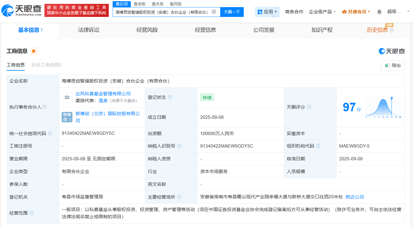 天眼查工商信息显示,近日,海博思创智储股权投资(安徽)合伙企业(有限合伙)成立,执行事务合伙人为达风私募基金管理有限公司、新博创(北京)国际控股有限公司,出资额10亿人民币,经营范围为以私募基金从事股权投资、投资管理、资产管理等活动。合伙人信息显示,该合伙企业由赣州金镒同达企业管理合伙企业(有限合伙)、北京丹诚资产管理有限公司、海博思创(688411)等共同出资。