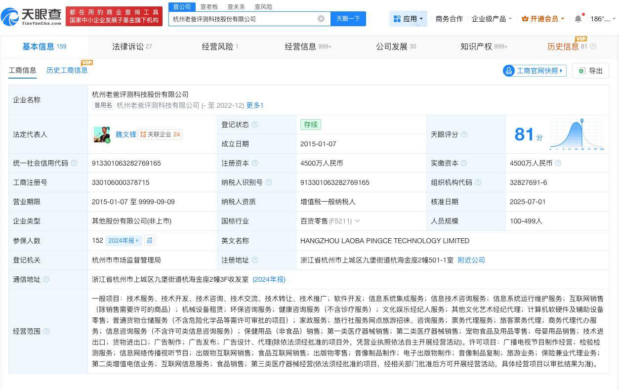 天眼查工商信息显示,杭州老爸评测科技股份有限公司成立于2015年1月,法定代表人为魏文锋,注册资本4500万人民币,经营范围含互联网销售、环保咨询服务、健康咨询服务、文化娱乐经纪人服务等。股东信息显示,该公司由杭州北溟控股有限公司、魏文锋等共同持股。
