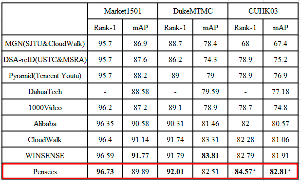 近日,澎思科技(Pensees)在行人再识别(Person Re-identification,简称ReID)算法上取得突破,在三大主流ReID数据集测试Market1501,DukeMTMC-reID,CUHK03中,算法关键指标首位命中率(Rank-1 Accuracy)获得业内最好成绩,刷新了世界纪录。