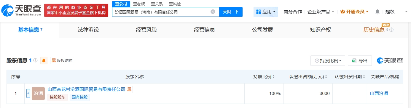 天眼查App显示,近日,汾酒国际贸易(海南)有限责任公司成立,法定代表人为相里宝宝,注册资本3000万人民币,经营范围包括酒类经营、酒制品生产、食品销售、食品经营管理等。股东信息显示,该公司由山西杏花村汾酒国际贸易有限责任公司全资持股。