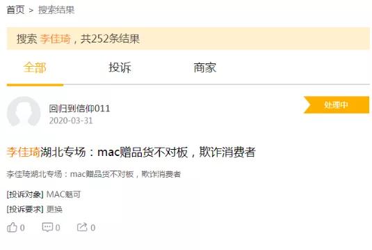 在追求一些全网最低价的结果就是收货时发现“货不对款”,要么就是阉割款,消费者维权难。头部主播也不例外,在黑猫投诉上,有关李佳琦的投诉达252条。