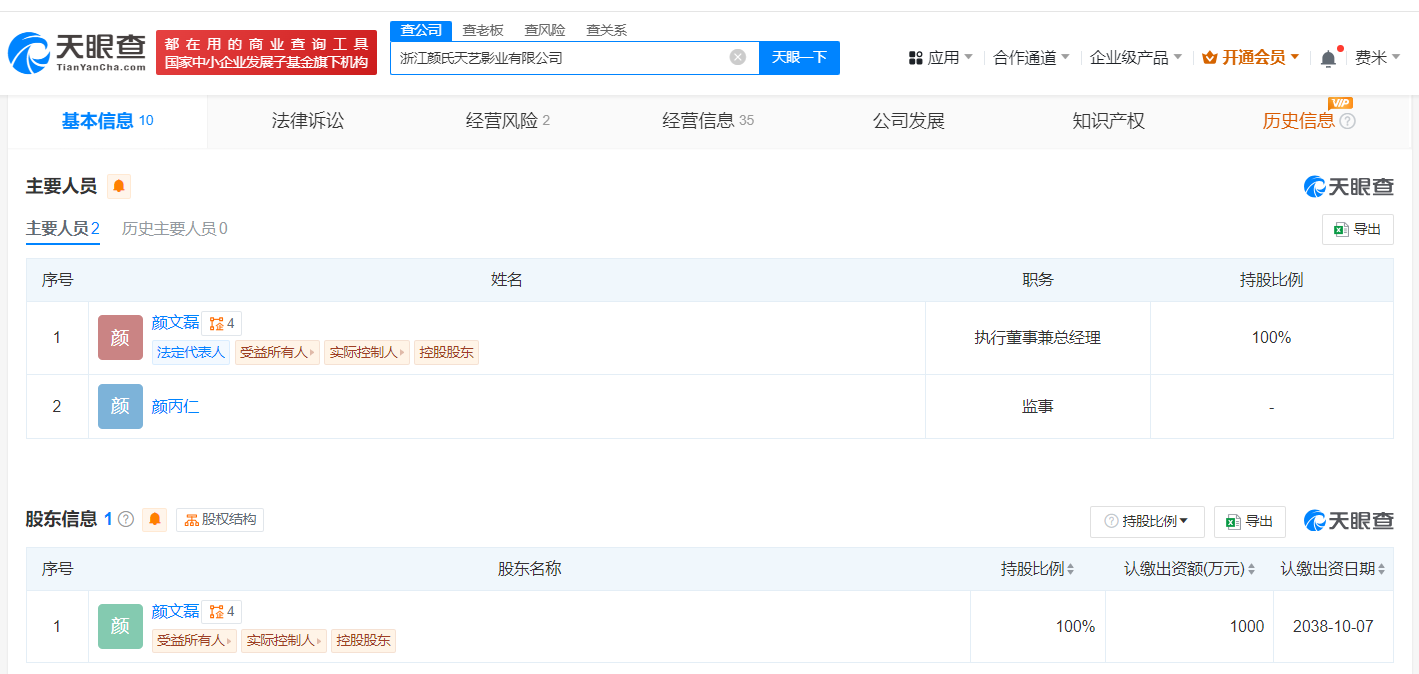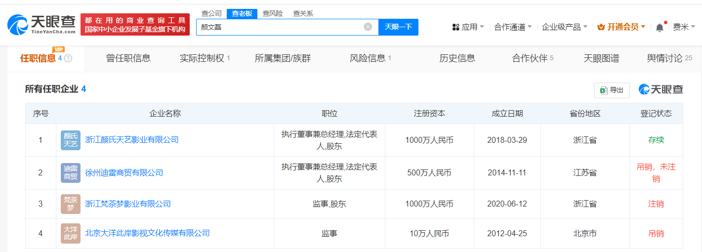 关联企业信息显示,颜文磊名下关联4家企业,仅上述公司为存续状态,其名下的徐州迪雷商贸有限公司、北京大洋此岸影视文化传媒有限公司处于吊销状态,浙江梵茶梦影业有限公司已注销。