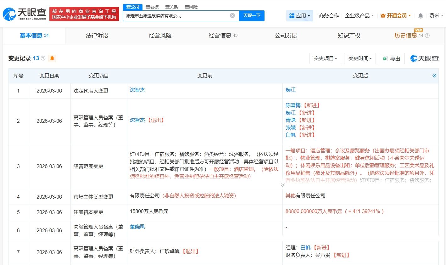 近日,康定市五康温泉酒店有限公司发生工商变更,新增五粮液集团旗下成都五粮液建设投资有限公司为股东,注册资本由1.58亿人民币增至8.08亿人民币,增幅约411%,沈智杰卸任法定代表人,由颜江接任,同时,多位主要人员发生变更。