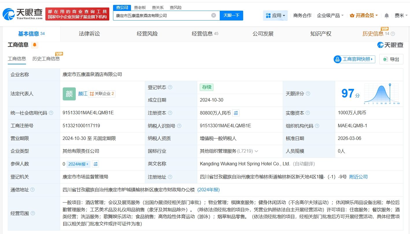 康定市五康温泉酒店有限公司成立于2024年10月,经营范围包括酒店管理、住宿服务、餐饮服务、洗浴服务等。股东信息显示,该公司现由康定市文旅投资开发有限责任公司及上述新增股东共同持股。
