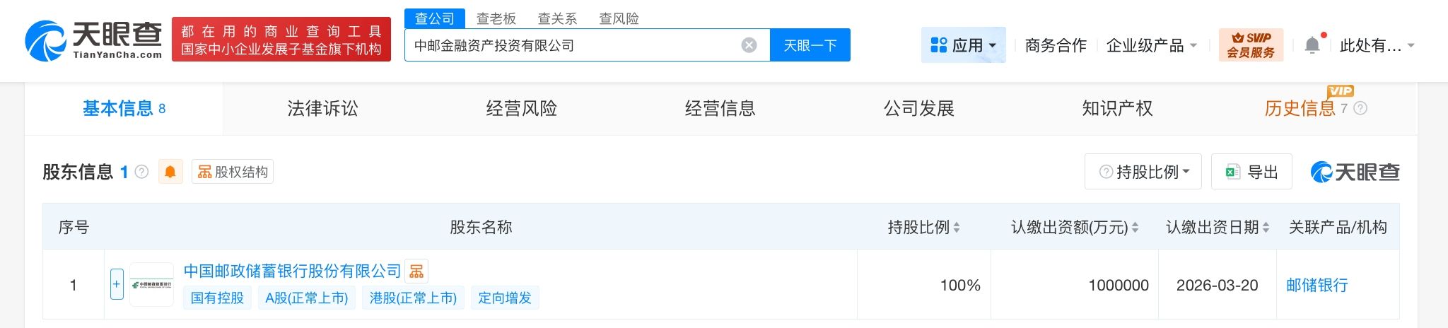 天眼查App显示,近日,中邮金融资产投资有限公司成立,法定代表人为杜春野,注册资本100亿人民币,经营范围为非银行金融业务。股东信息显示,该公司由邮储银行(601658)全资持股。