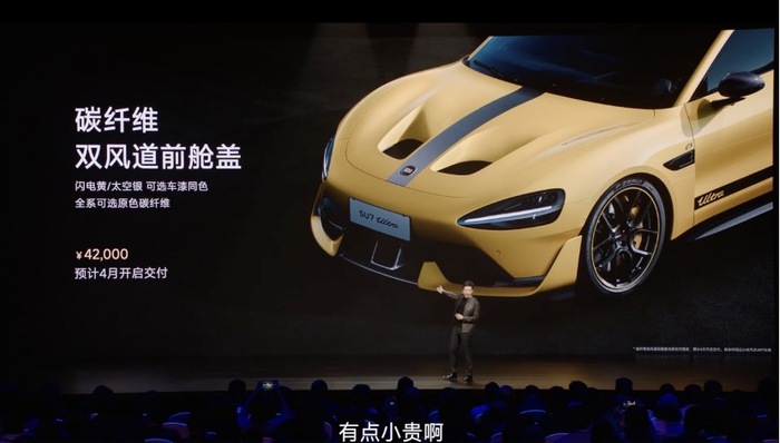 “碳纤维双风道前舱盖售价4.2万元,有点小贵,所以我也不推荐大家买。”雷军在发布会上这样说。当他向台下问“买吗”的时候,得到的是更为响亮的“买”的回应。