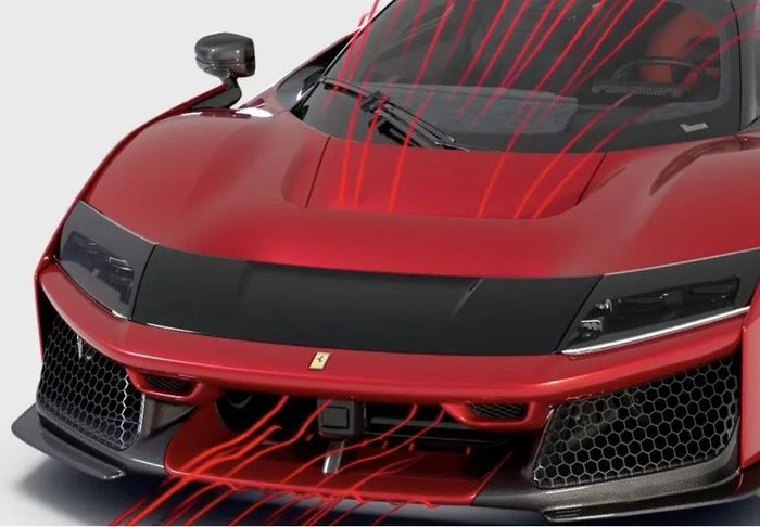 法拉利F80的前舱也有经过特殊设计的空气动力学通道。由碳纤维制成的前盖上设计了一个S-Duct空气动力学通道,该通道借助自身的固定部件,将两个前翼完美衔接。通道内部,两片襟翼沿主体轮廓精心布局,共同形成了三翼面前翼设计。法拉利在官网的演示动画显示,进气格栅和底盘下风的气流都可以通过这个通道得到正确引导,为车身提供良好的稳定性、散热能力。