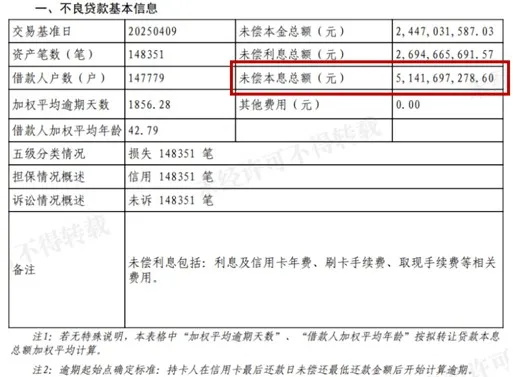 此次在银登中心挂牌转让的51.42亿元信用卡不良资产包,更是凸显了该业务的风险积聚——加权平均逾期天数1856.28天(约5年),借款人加权平均年龄42.79岁,对应14.78万个家庭的债务困境,折射出民生银行在客户筛选、风险管控上的明显漏洞。