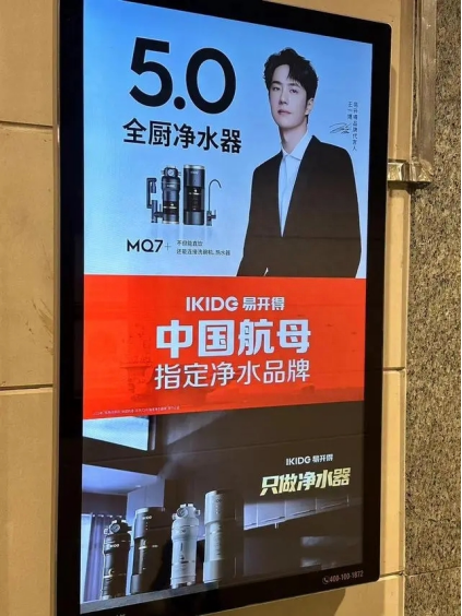 近日据羊城晚报消息,来自广州的李先生注意到,在梯间的广告照片中,净水器品牌易开得以显眼的红底白字介绍自身为“中国航母指定净水品牌”。而其下方小字,则不太突出的注解为“获得中国航母(系列文创)指定净水品牌荣誉认证”。