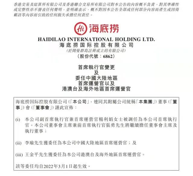 近日,海底捞方发布管理层人事任命公告:副首席执行官兼首席运营官杨利娟调任首席执行官,董事会主席兼前首席执行官张勇将继续担任董事会主席及执行董事;李瑜出任海底捞中国大陆地区首席运营官,王金平出任港澳台及海外地区首席运营官。