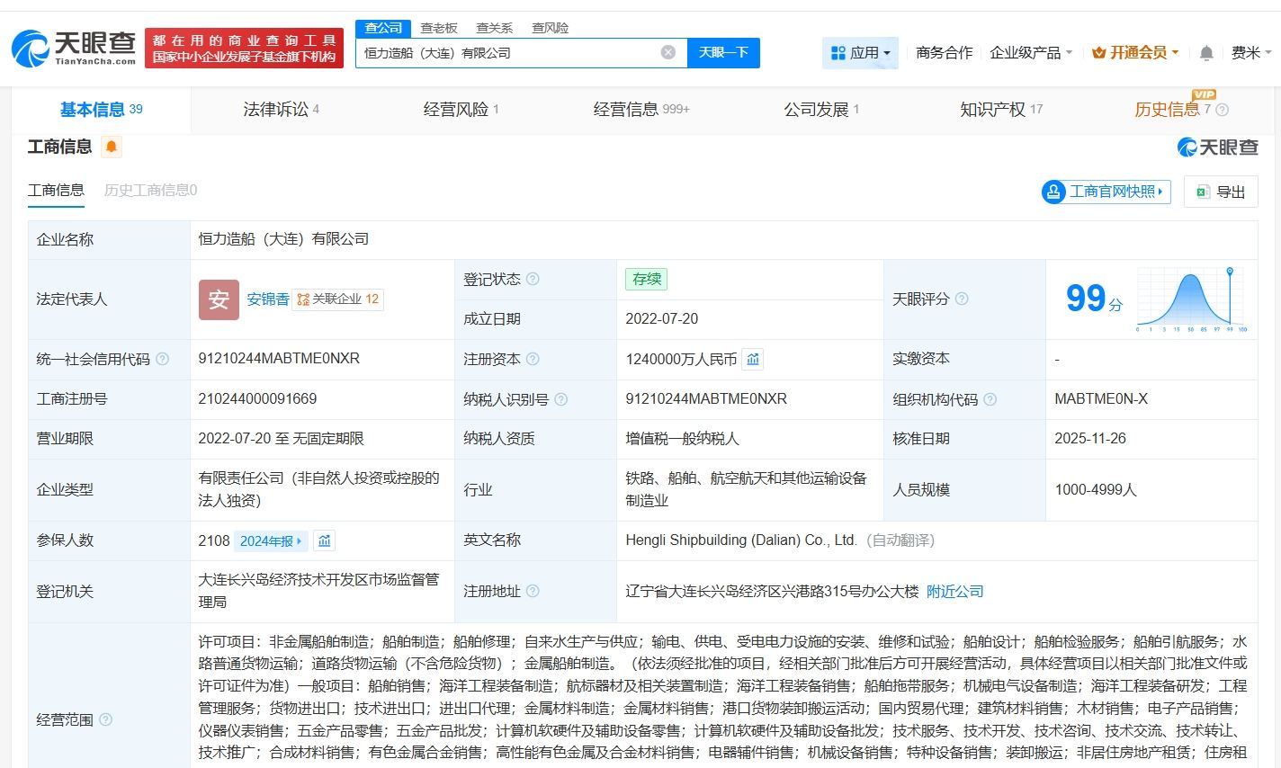 恒力造船(大连)有限公司成立于2022年7月,法定代表人为安锦香,经营范围包括非金属船舶制造、船舶制造、船舶修理等。股东信息显示,该公司由恒力重工集团有限公司全资持股。