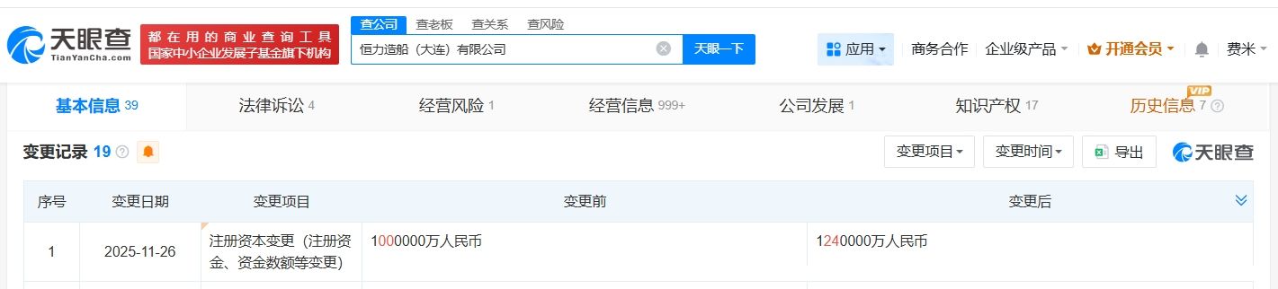 天眼查工商信息显示,近日,恒力造船(大连)有限公司发生工商变更,注册资本由100亿人民币增至124亿人民币,增幅24%。