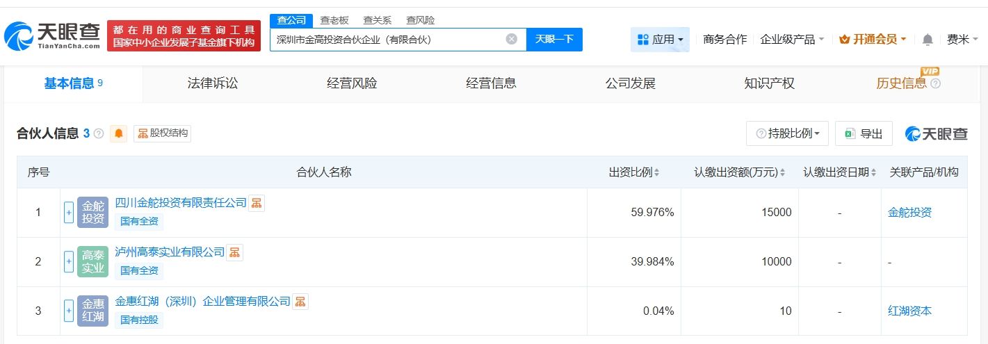 天眼查App显示,近日,深圳市金高投资合伙企业(有限合伙)成立,执行事务合伙人为金惠红湖(深圳)企业管理有限公司,出资额约2.5亿人民币,经营范围为以自有资金从事投资活动、企业管理、企业管理咨询、财务咨询,由泸州老窖集团旗下四川金舵投资有限责任公司、泸州高泰实业有限公司、金惠红湖(深圳)企业管理有限公司共同出资。