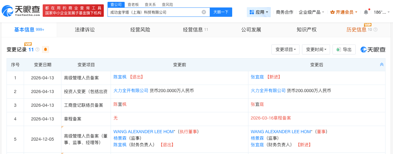 天眼查App显示,4月13日,成功金字塔(上海)科贸有限公司发生高管变更,陈宜枫退出,由张宜庭接任。