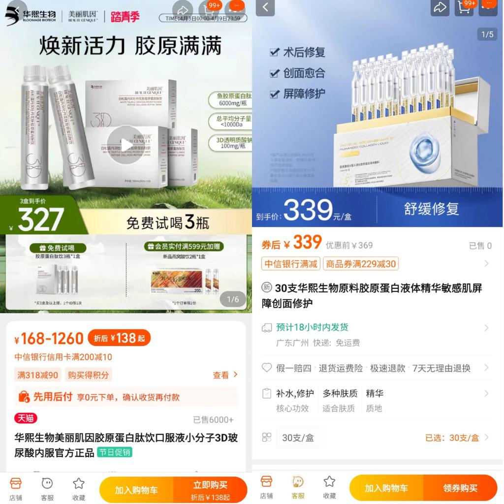 淘宝显示,华熙生物的胶原蛋白精华 30 支的价格为 339 元,胶原蛋白肽饮口服液一盒十瓶,售价 138 元。