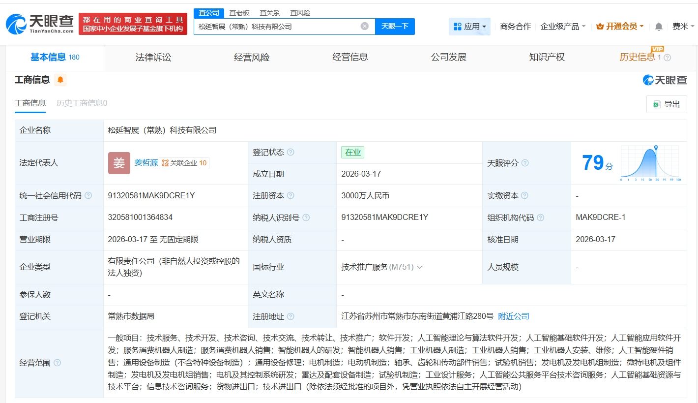 天眼查工商信息显示,近日,松延智展(常熟)科技有限公司成立,法定代表人为姜哲源,注册资本3000万人民币,经营范围包括人工智能理论与算法软件开发、服务消费机器人制造、智能机器人的研发等。