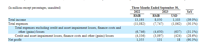 截至9月30日,贷款余额为3663亿元,同比下降42.5%;第三季度新增贷款505亿元,与2022年同期的1238亿元相比下降59.2%。