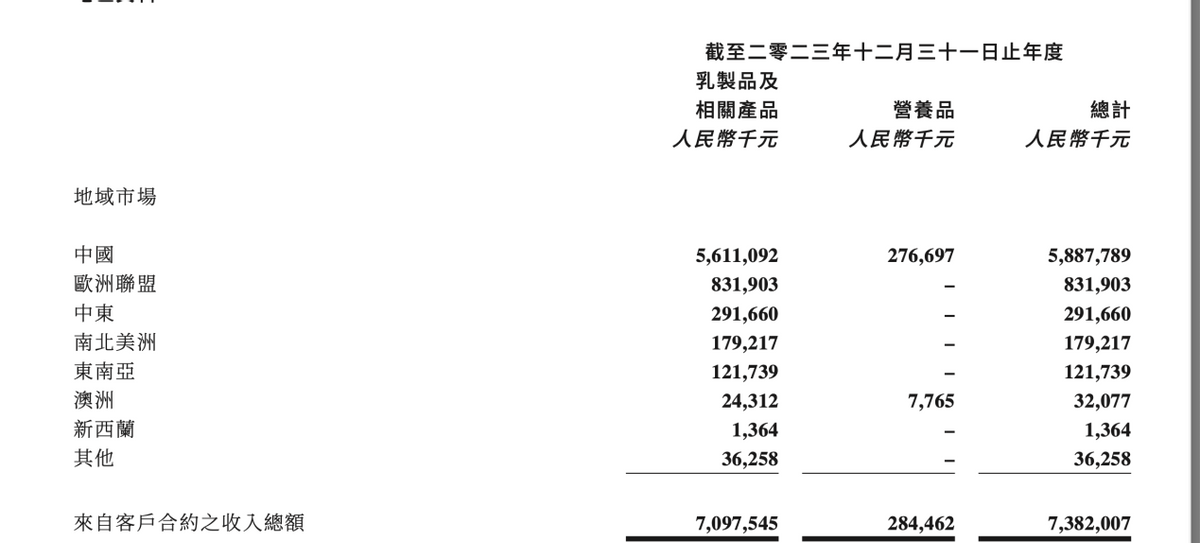 顺手扒了一下澳优2020年的财报,当年澳优的收入结构上,占比最多的同样是乳制品业务,占比98%,营养品营收占比仅2%,其中,营收占比最高的奶粉业务,非中国地区营收占比仅有9.2%。