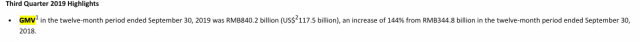 除了营收上的优异表现之外,拼多多在GMV上的表现也不俗。数据显示,截至2019年9月30日的12个月期间,拼多多平台GMV达8402亿元,较去年同期的3488亿元同比增长144%。期间,平台活跃买家年度平均消费额进一步增长至1566.7元,较去年同期的894.4元增长75%。