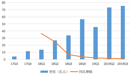 今年三季度,拼多多营收增长主要来源于平台在线营销技术服务收入的强劲增长。数据显示,三季度,拼多多在线营销技术服务收入为67.11亿元,较去年同期的人民币29.741亿元增长126%;平台交易服务收入为8.05亿元,较去年同期的3.983亿元增长101%。其中,拼多多的交易服务营收主要由向商家收取的交易佣金构成。虽然三季度的交易服务收入同比增长高达101%,但是从环比上来看,该数据相对于二季度有所下滑,而这也是由于三季度是电商行业淡季的原因。