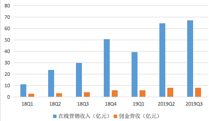 三季度,拼多多实现营收75.139亿元,较去年同期的33.724亿元同比增长123%,高于市场预期的74.85亿元。同时,根据财报披露的数据显示,拼多多的营收主要来自两个方面,分别是在线营销技术服务以及佣金收入。在创造营收方面,拼多多在发展的三四年时间里,有所改变,从当初的依靠商品销售,到现在的向服务方面转变,向“卖广告”转变。