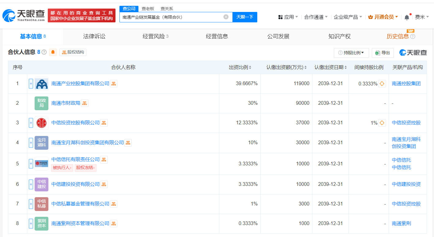 天眼查App显示,近日,南通产业链发展基金(有限合伙)成立,执行事务合伙人为南通紫荆资本管理有限公司、中信私募基金管理有限公司,出资额30亿人民币,经营范围为创业投资,以私募基金从事股权投资、投资管理、资产管理等活动,由南通产业控股集团有限公司、南通市财政局、中信投资控股有限公司等共同出资。