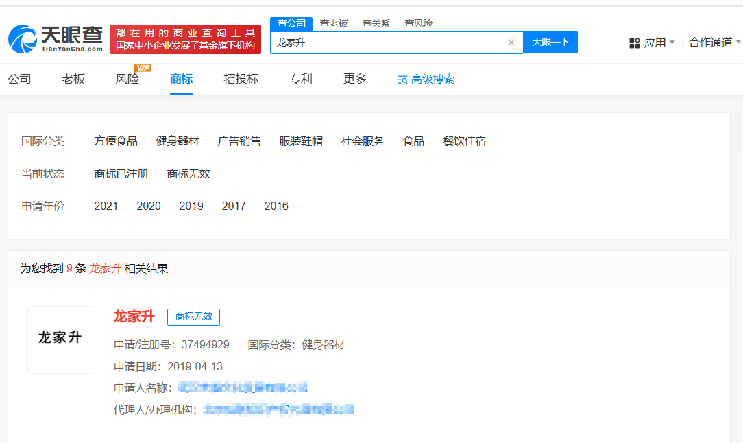 天眼查知识产权信息显示,武汉一文化公司于2019年申请注册“龙家升”商标,国际分类为健身器材,当前该商标已被驳回,处于无效状态。