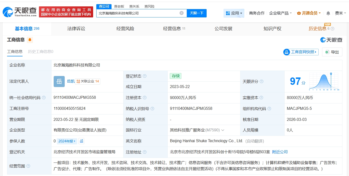 北京瀚海数科科技有限公司成立于2023年5月,法定代表人为岳凯,经营范围包括信息咨询服务、计算机软硬件及辅助设备零售、广告发布等。股东信息显示,该公司由小米金融(香港)有限公司全资持股。