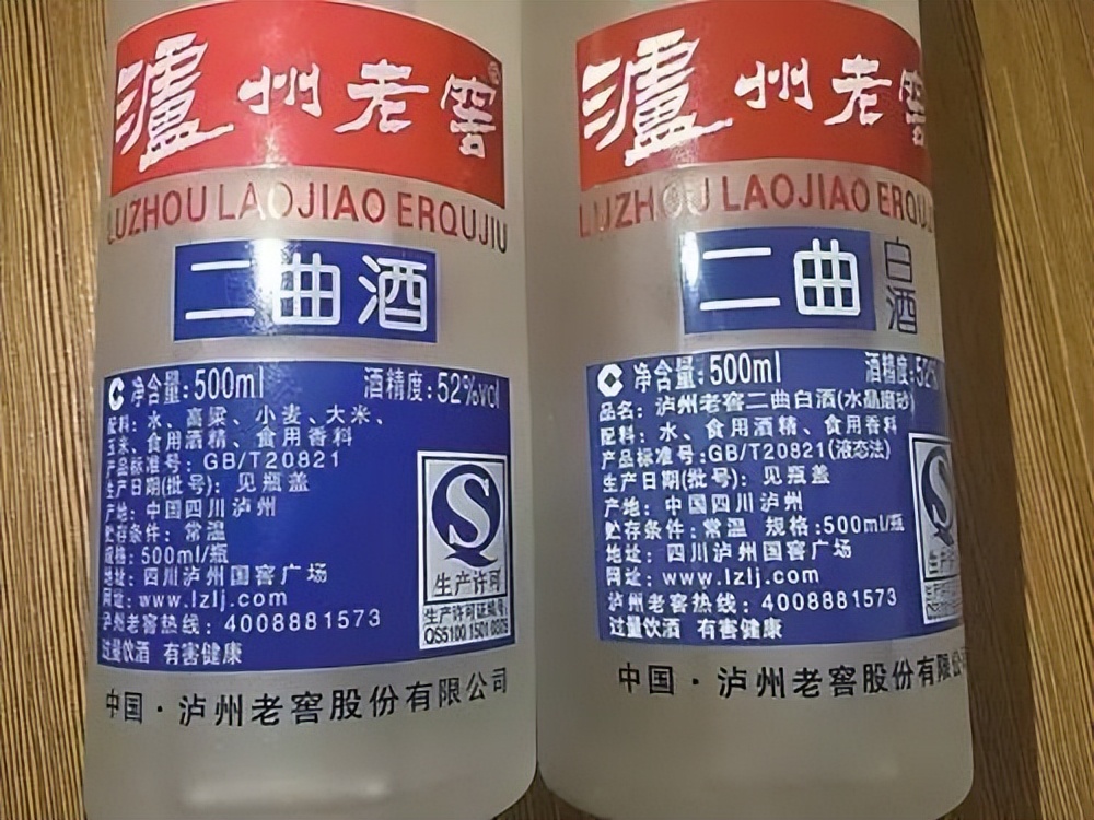 具有讽刺意义的是,泸州老窖却悄悄地改掉了被质疑的标签(见上图)。右边这款二曲酒的标签上已经不再标注“高粱、小麦、大米、玉米”,而是恢复了“水、食用酒精、食用香料”。