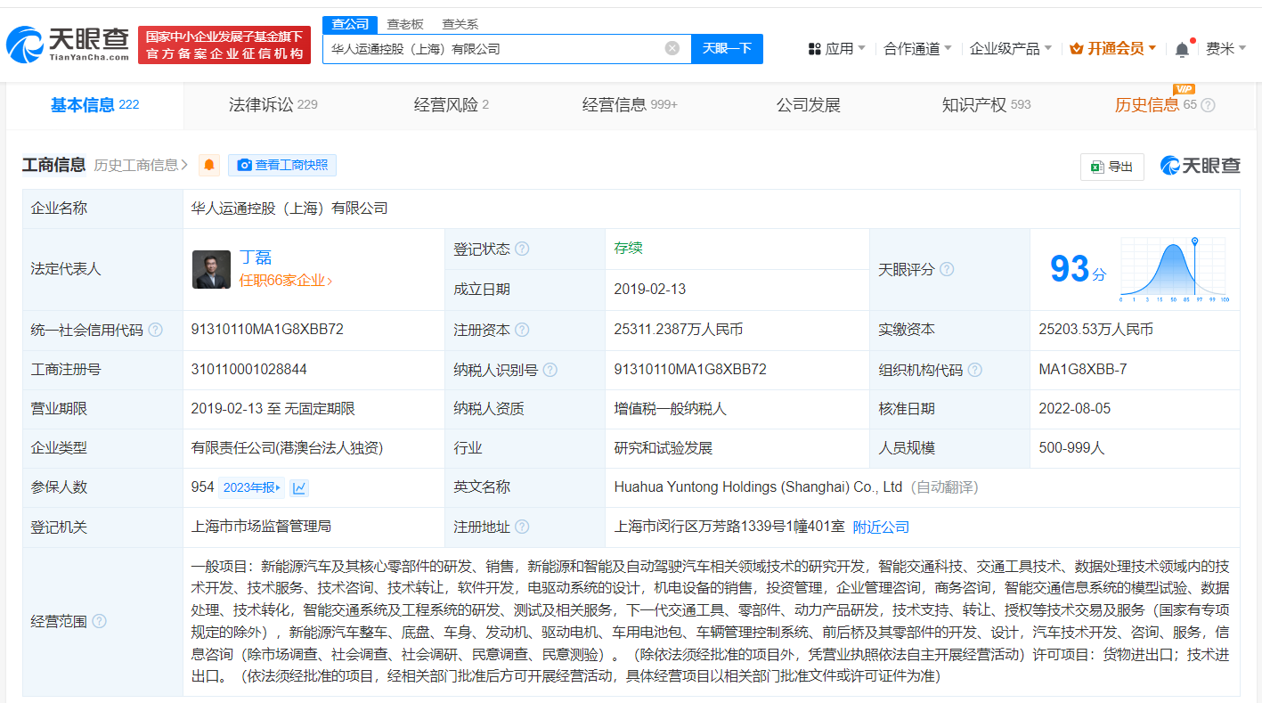 华人运通控股(上海)有限公司成立于2019年2月,法定代表人为丁磊,注册资本约2.53亿人民币,由华人运通投资有限公司全资持股。风险信息显示,该公司现存5条被执行人信息,被执行总金额超3亿元,此外还存在多条股权冻结、限制消费令和失信被执行人(老赖)信息。