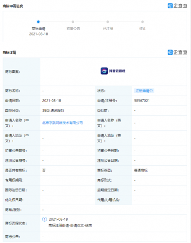 【TechWeb】企查查APP显示,近日,北京字跳网络技术有限公司新增多项“抖音云游戏”商标申请信息,国际分类涉及广告销售、教育娱乐、通讯服务等,目前商标状态均为“注册申请中”。
