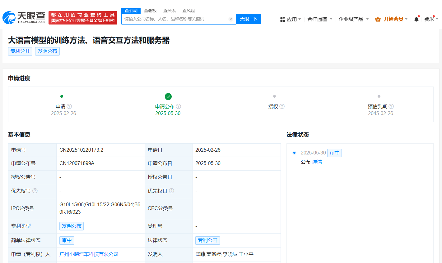 天眼查财产线索信息显示,5月30日,广州小鹏汽车科技有限公司申请的“大语言模型的训练方法、语音交互方法和服务器”专利公布。