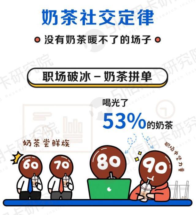 这与市场对奶茶的欢迎程度不无关系。来自51信用卡研究院的《谁的日常“续命水”》报告(以下简称“51信用卡研究院报告”)显示,作为职场中坚力量的80后、90后们在奶茶市场占据半壁江山,“奶茶社交的背后,意味着职场人渴望并在努力建立一种平等、轻松、积极、更具沟通性的职场氛围。”
