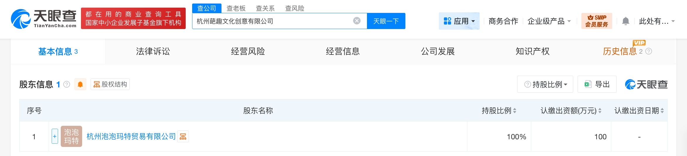天眼查工商信息显示,近日,杭州葩趣文化创意有限公司成立,法定代表人为代雨茹,注册资本100万人民币,经营范围含日用百货销售、日用品销售、互联网销售、人力资源服务、商务代理代办服务、个人商务服务、电子产品销售、机械设备租赁等。股东信息显示,该公司由泡泡玛特旗下杭州泡泡玛特贸易有限公司全资持股。