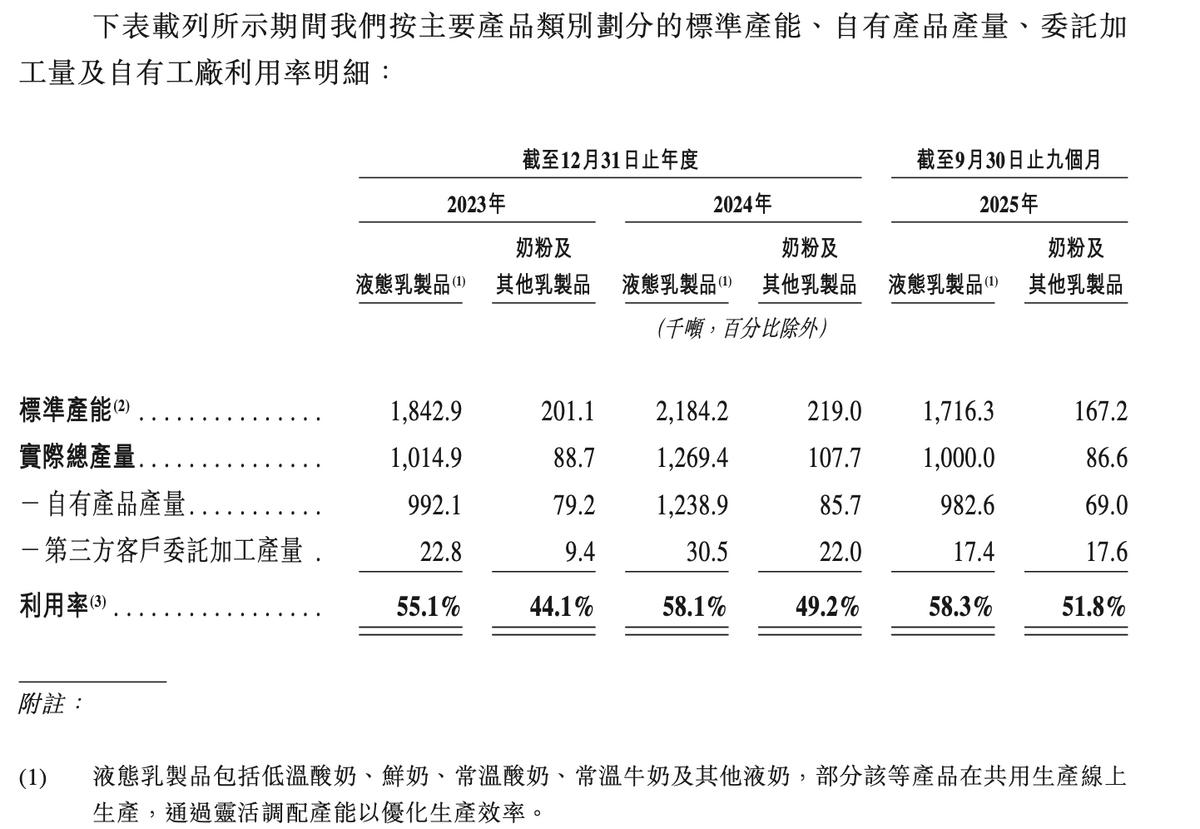 但是细看招股书会发现,君乐宝近几年产能利用率普遍不超过60%。2025年前九个月,其液态乳制品产能利用率58.3%,奶粉及其他乳制品产能利用率51.8%。