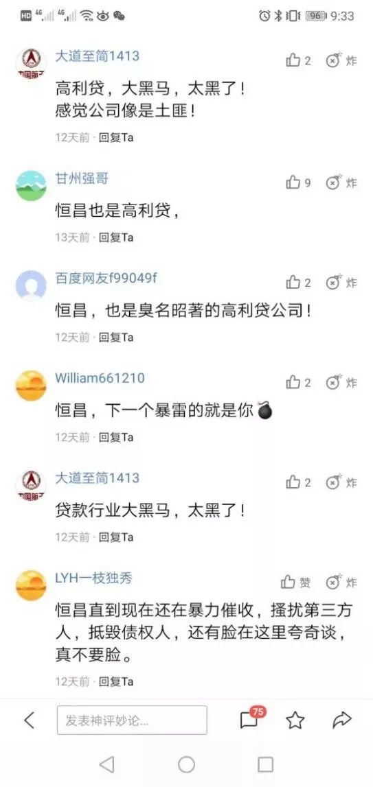 在恒昌周年庆之际,山东某官方媒体发布了《恒昌创始人兼CEO秦洪涛八周年致辞》一文。尴尬的是,该文评论区却被“攻陷”。网友炮轰恒昌:“贷款行业大黑马,太黑了!”“高利贷,砍头息,恒昌的爆雷快来了”“恒昌直到现在还在暴力催收,骚扰第三方人”……