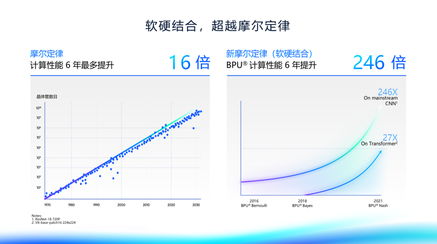软硬结合,超越摩尔定律。我们再来看一下“新摩尔定律”带来性能的提升,左边是传统的摩尔定律,在6年可以看到它的性能提升16倍。基于软硬结合的“新摩尔定律”,我们BPU的计算性能对于传统主流的CNN神经网络它在6年里面提升了246倍。对于现在的Transformer来讲,在三年里面提升了27倍。实际上我们通过软件和硬件的优化,远超摩尔定律提升的速度。