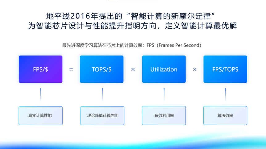 这个为我们地平线也是为其他行业的同仁提供了一个芯片设计和性能提升的方向,定义智能计算最优解。新摩尔定律的公式也很简单,是一个简单的乘法。就是说我把单位成本下的计算性能作为目标,把这个目标分解成三个因子: