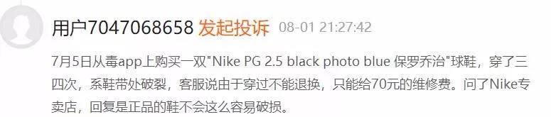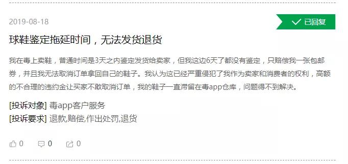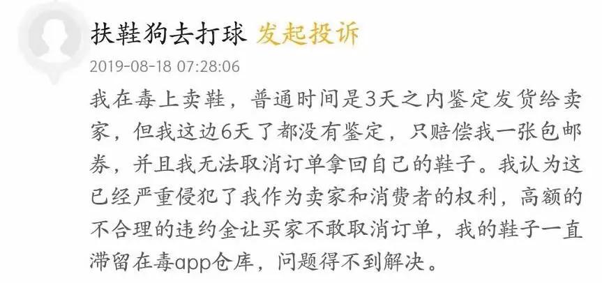 其中投诉问题中逾期未发货更是成为热点,其中一则投诉在毒APP上买的球鞋,鉴定五天无任何结果,要求赔偿保证金,和差价。由于平台鉴定时间太久,影响了正常销售,其中损失的差价和保证金平台更是不予保障。