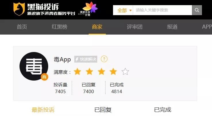 但在最近的黑猫投诉榜中,毒app一直位居用户投诉前列。
