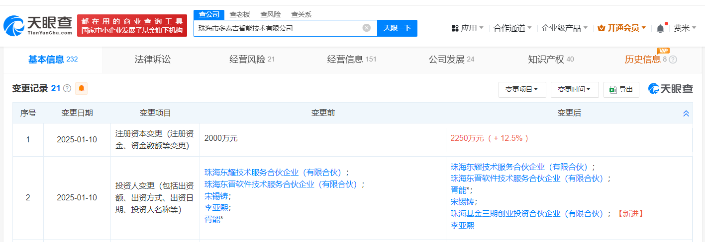 天眼查App显示,近日,珠海市多泰吉智能技术有限公司发生工商变更,新增格力集团旗下珠海基金三期创业投资合伙企业(有限合伙)为股东,同时注册资本由2000万人民币增至2250万人民币。