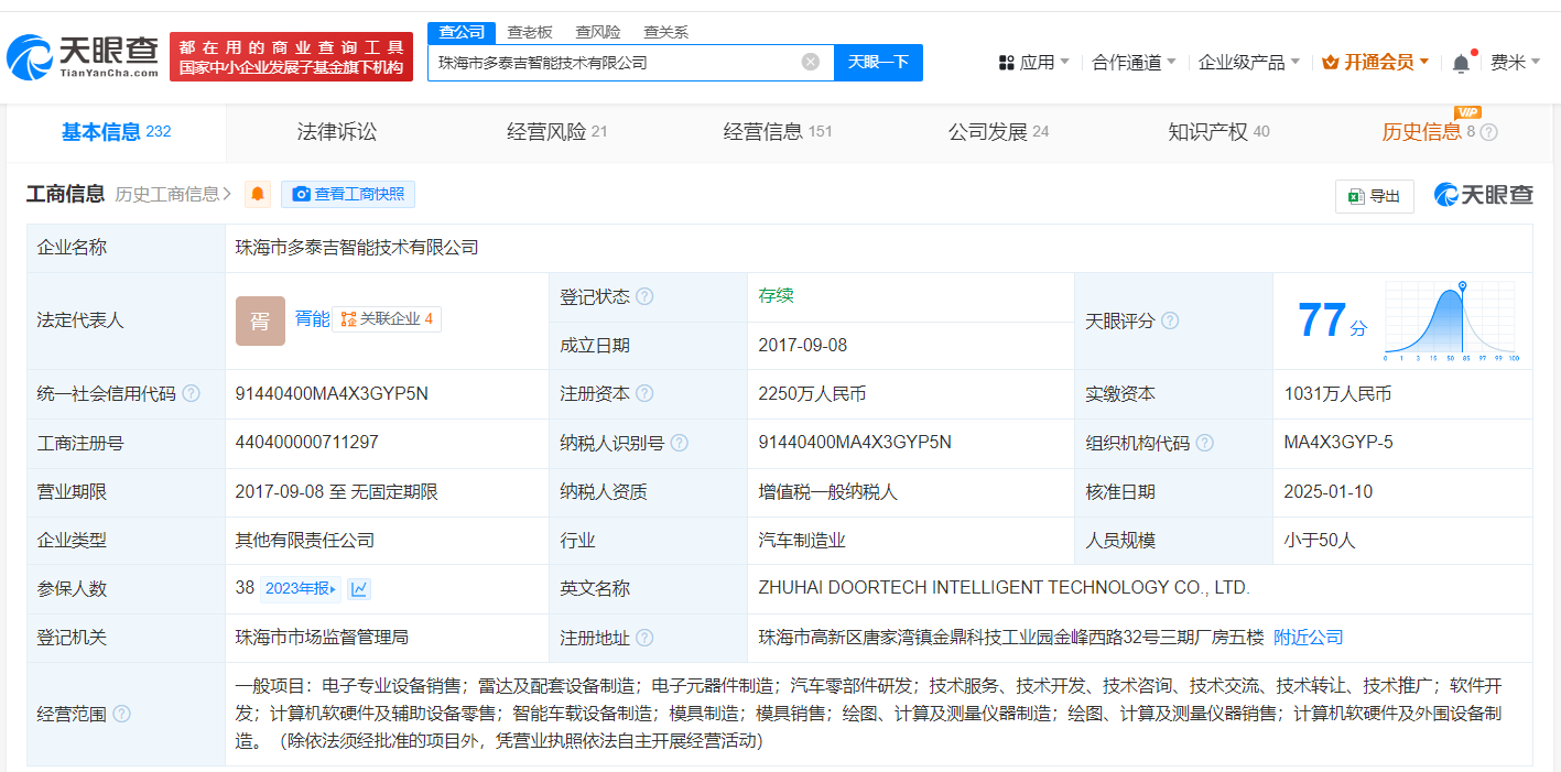 珠海市多泰吉智能技术有限公司成立于2017年9月,法定代表人为胥能,经营范围含电子专业设备销售、雷达及配套设备制造、电子元器件制造、汽车零部件研发、计算机软硬件及辅助设备零售、智能车载设备制造等,现由宋锡铸、胥能、珠海东耀技术服务合伙企业(有限合伙)等及上述新增股东共同持股。官网显示,该公司是一家传感器及执行器厂商。