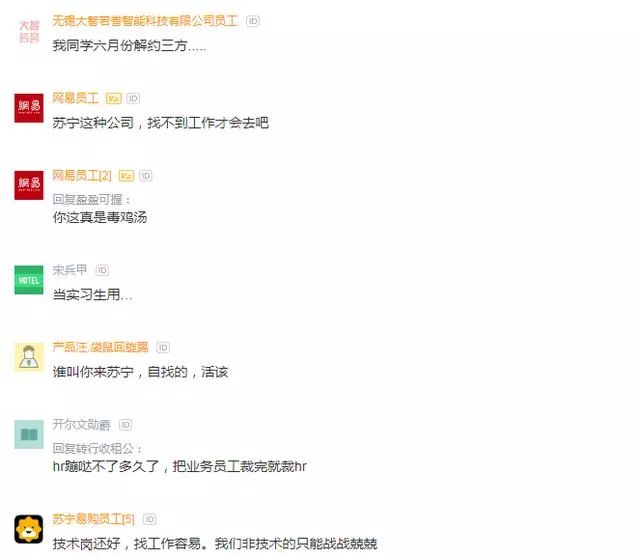 也有网友吐槽到。同19届被裁,组里应届生全被裁了。有什么公司招毕业两个多月的吗?java开发,跪求,应届生还是别去苏宁了,哎!技术岗还好,找工作容易。我们非技术的只能战战兢兢,赶紧走吧,早走早超生!裁应届生的公司都是垃圾,管理层人品低下。