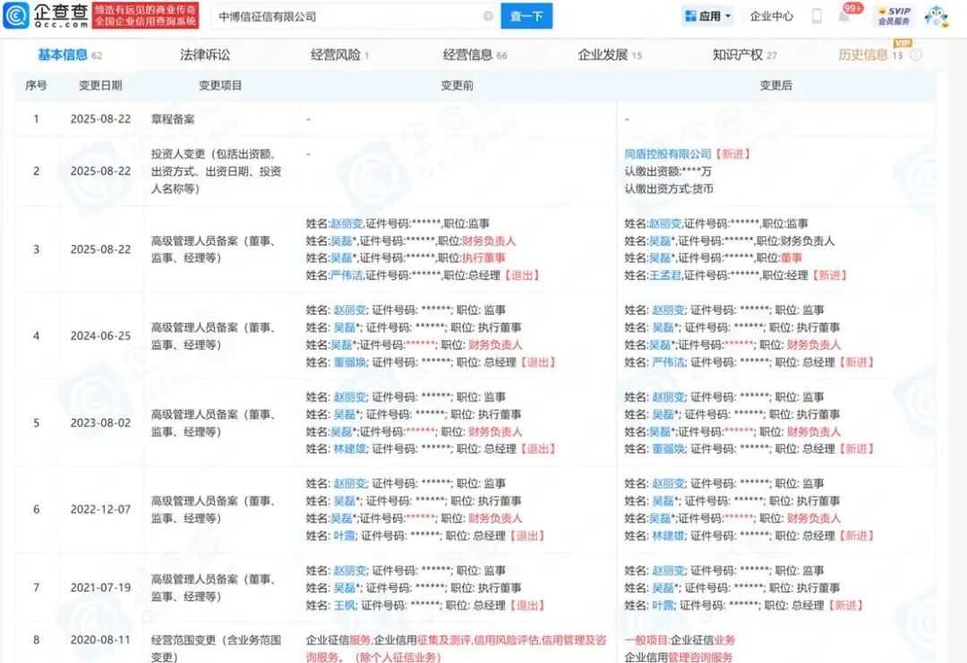 其中,杭州逾期管家信息技术有限公责任公司已被注销,中博信征信有限公司自2021年开始不断发生人员变更。