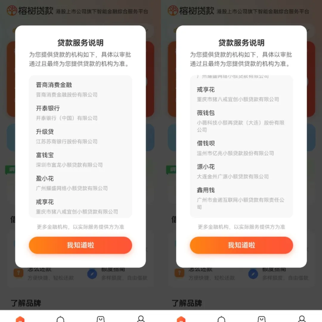 榕树贷款App显示,其导流的贷款机构及产品包括:晋商消金、开泰银行、苏商银行、富龙小贷(富钱宝)、耀盛小贷(盈小花)、猪八戒小贷(戒享花)、小薇再贷款(薇钱包)、亿兆小贷(借钱呗)、广源小贷(源小花)、金诺小贷(鑫用钱)。