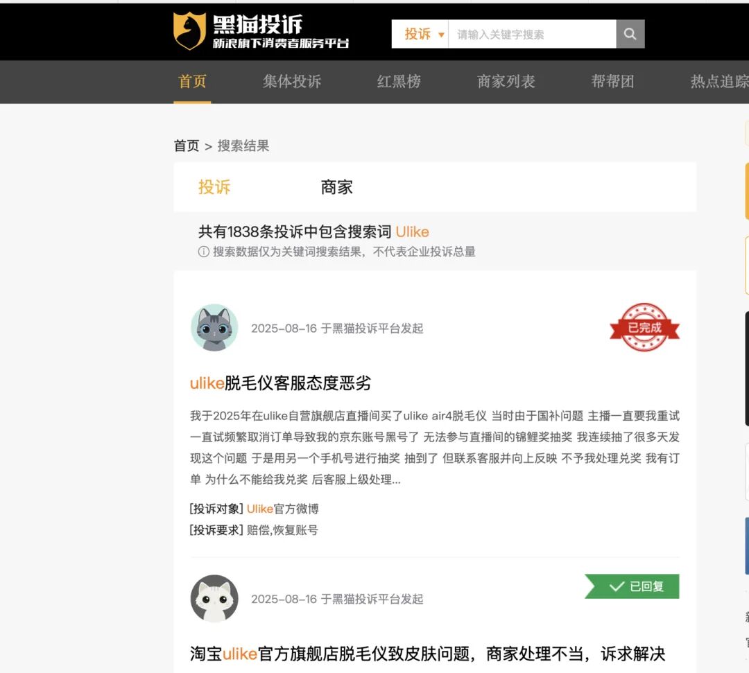 黑猫投诉显示,以“Ulike”为关键词进行检索,投诉量高达1838条,其中大多涉及虚假宣传、欺骗消费者以及客服态度恶劣。其中,有消费者投诉称,自己在Ulike官方旗舰店购买的脱毛仪,使用后出现皮肤问题,包括红肿、疼痛、脱毛处发黑以及过敏等症状,因而提起退货退款投诉,但Ulike却不承认医院的检查结果,拒不承担责任。