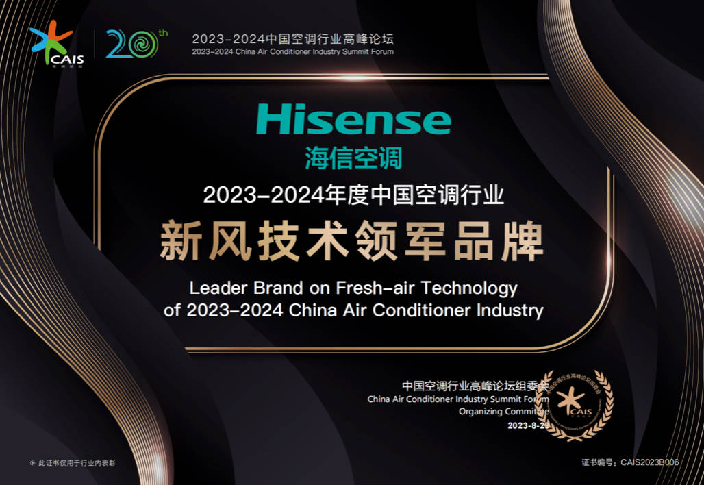 在技术与口碑的加持下,2023上半年,海信空调凭借技术创新、品牌形象升级、积极履行社会责任等方面的出色表现,在行业内屡获佳绩,先后荣获“中国空调行业首个三星碳标签产品认证”“第七届南山奖”“2023年度艾普兰优秀产品奖”“2023-2024中国空调行业新风技术领军品牌奖”和“中国空调行业风华二十年特别贡献奖”等诸多殊荣。
