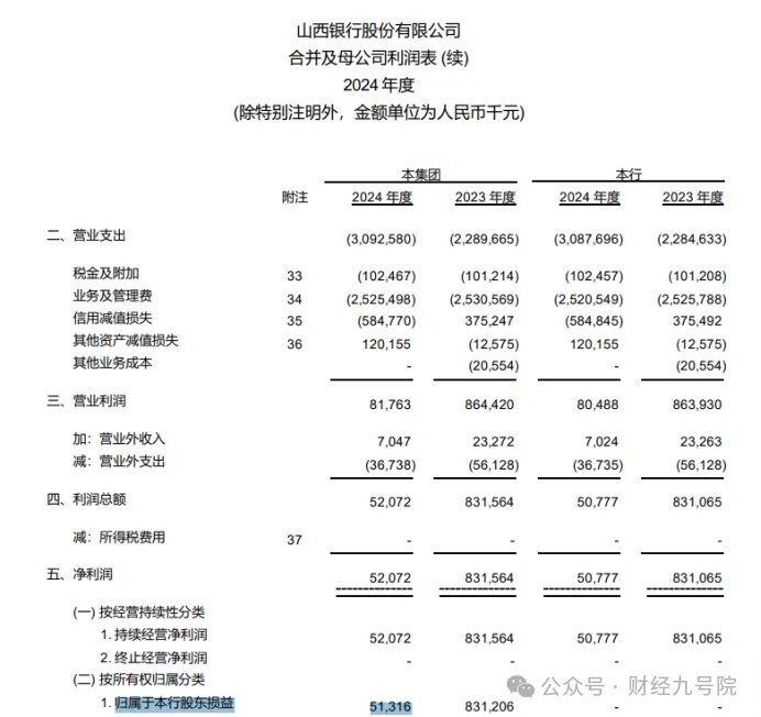 山西银行的经营颓势在李颖耀正式就任行长后就来了一波“下马威”。数据显示,2024年该行就出现了利润暴跌的尴尬局面,全年实现营业收入31.74亿元,同比仅微增0.64%,但净利润却从2023 年的8.31亿元骤降至0.51亿元,降幅高达93.8%。